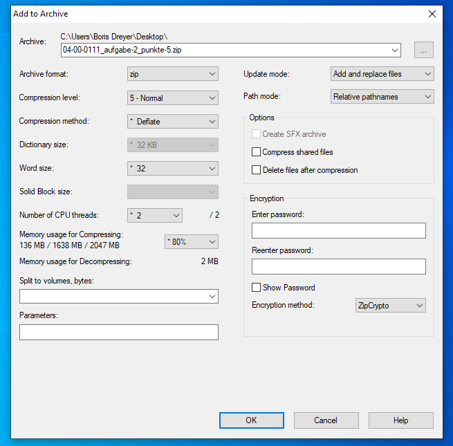 Erstellung eines Aufgabenarchivs mittels 7-Zip für Windows. Archivformat zip, Kompressionsmethode Deflate und Wortbreite 32 sind zu wählen.